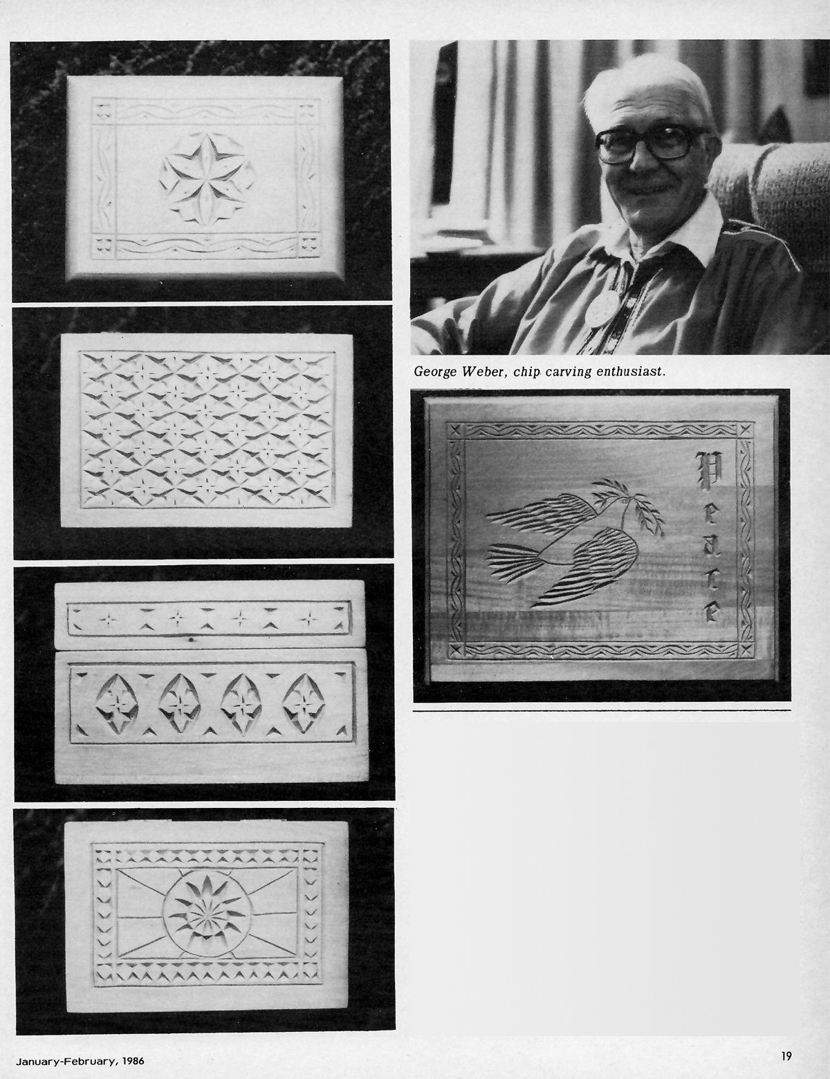 Below is a scan of an article in the Chip Chats magazine, Volume 33, Number 1, January-February 1986, by the National Wood Carvers Association. The article by Wayne Barton features chip-carving classes in San Jose and the work of George Weber, a member of the Santa Clara Valley Carvers. Pages 18 and 19: