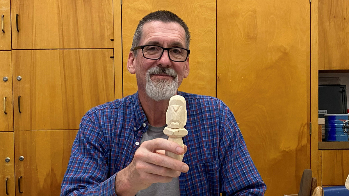 In the photo, he’s carving a basswood penguin inspired by Doug Linker’s video.