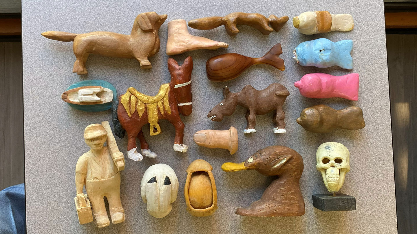 Jim has been whittling for so long that he can’t recall when he first picked up a carving knife. We’re putting together a gallery of his work, and this photo offers a sneak peek at a few of his projects.