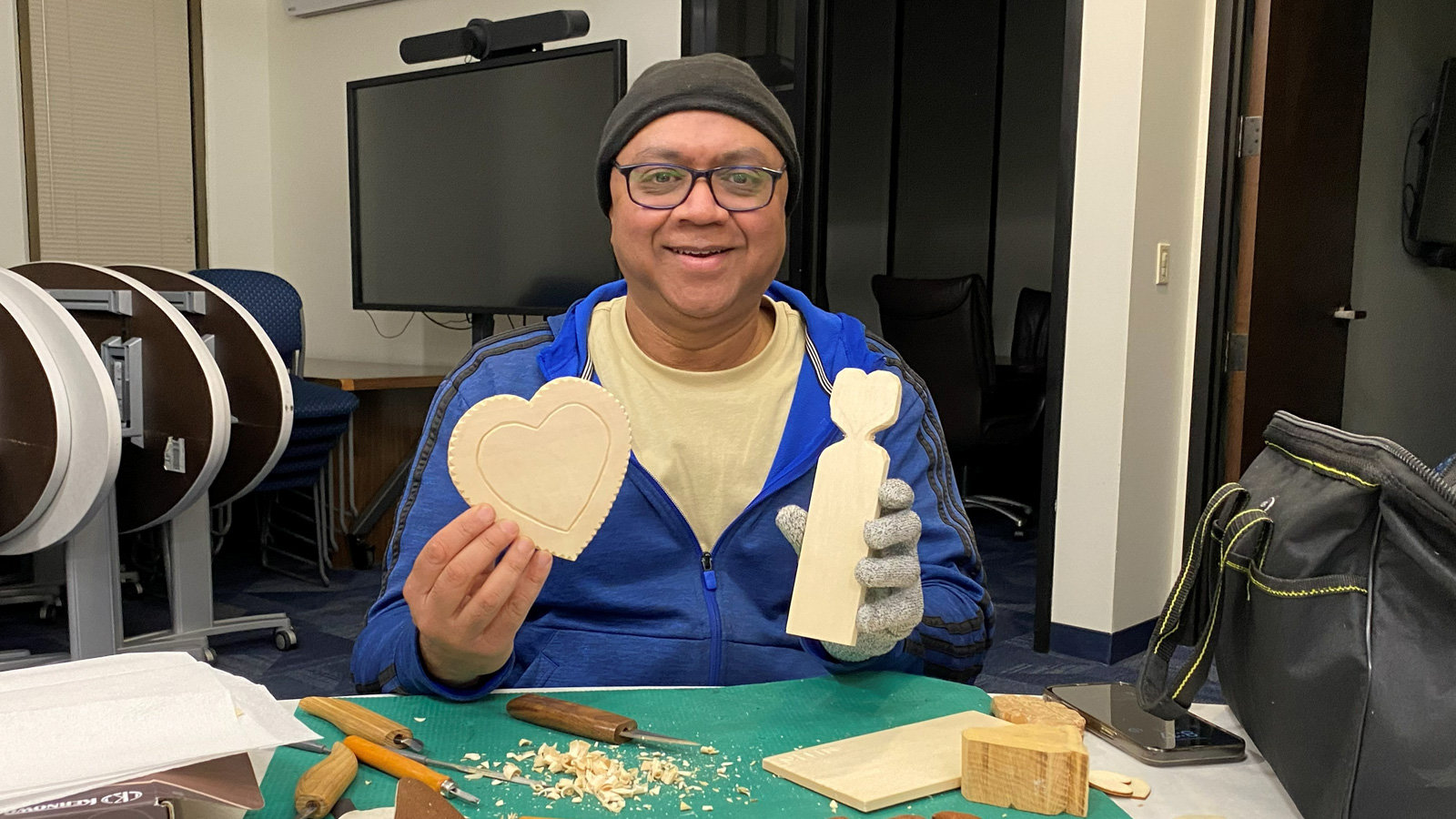 Nitin is gearing up for Valentine’s Day, carving both large and small hearts. The big one features a Tramp‑art‑inspired border, and we’re eager to see which design he’ll carve in its center.