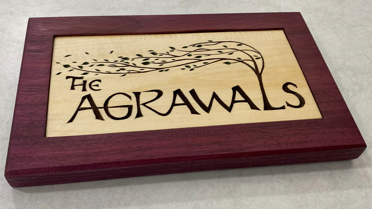 Pranay never fails to amaze us with his woodcarving talent. Last month, he carved a beautiful family sign with chip-carved lettering and a purple wood frame.