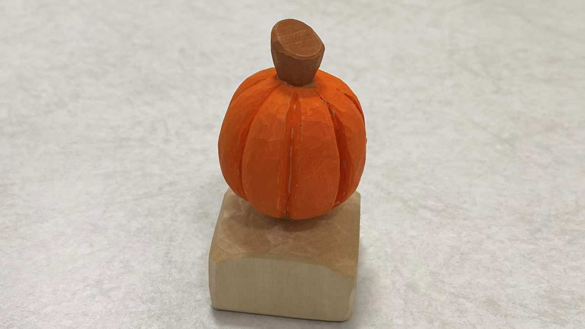 Xiaohan began whittling a heart at our recent workshop. He also completed his first project, a vibrantly painted pumpkin.